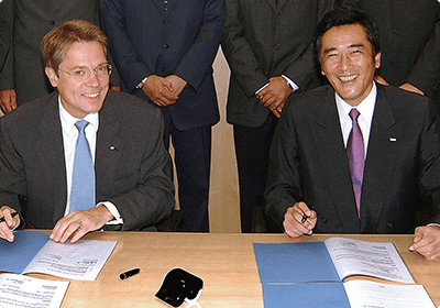 President Takaoki Kitano (left) at the signing ceremony for the joint venture agreement with Renault. On the right is Director-General Anon